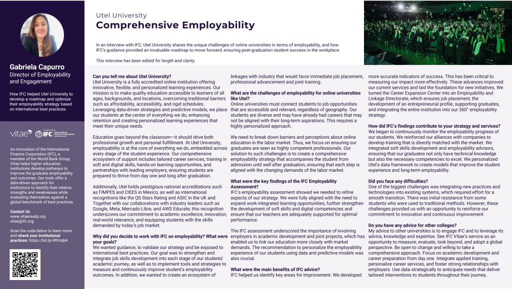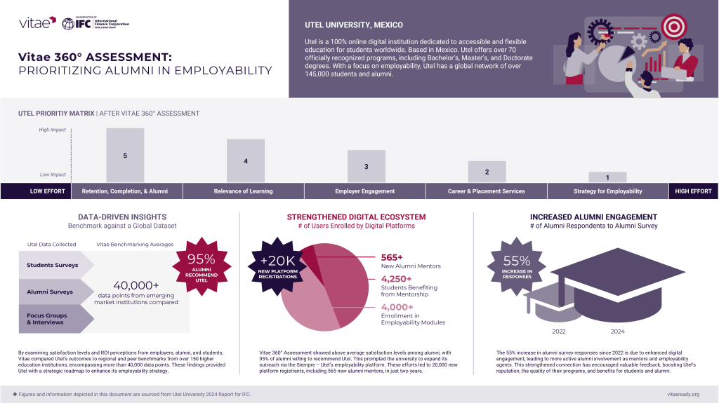 Beginning in 2022, UTEL participated in IFC’s Vitae 360° Assessment which examined satisfaction levels and ROI perceptions from employers, alumni, and students. Vitae compared Utel’s outcomes to regional and peer benchmarks from over 150 higher education institutions, encompassing more than 40,000 data points. These findings provided Utel with a strategic roadmap to enhance its employability strategy, resulting in: